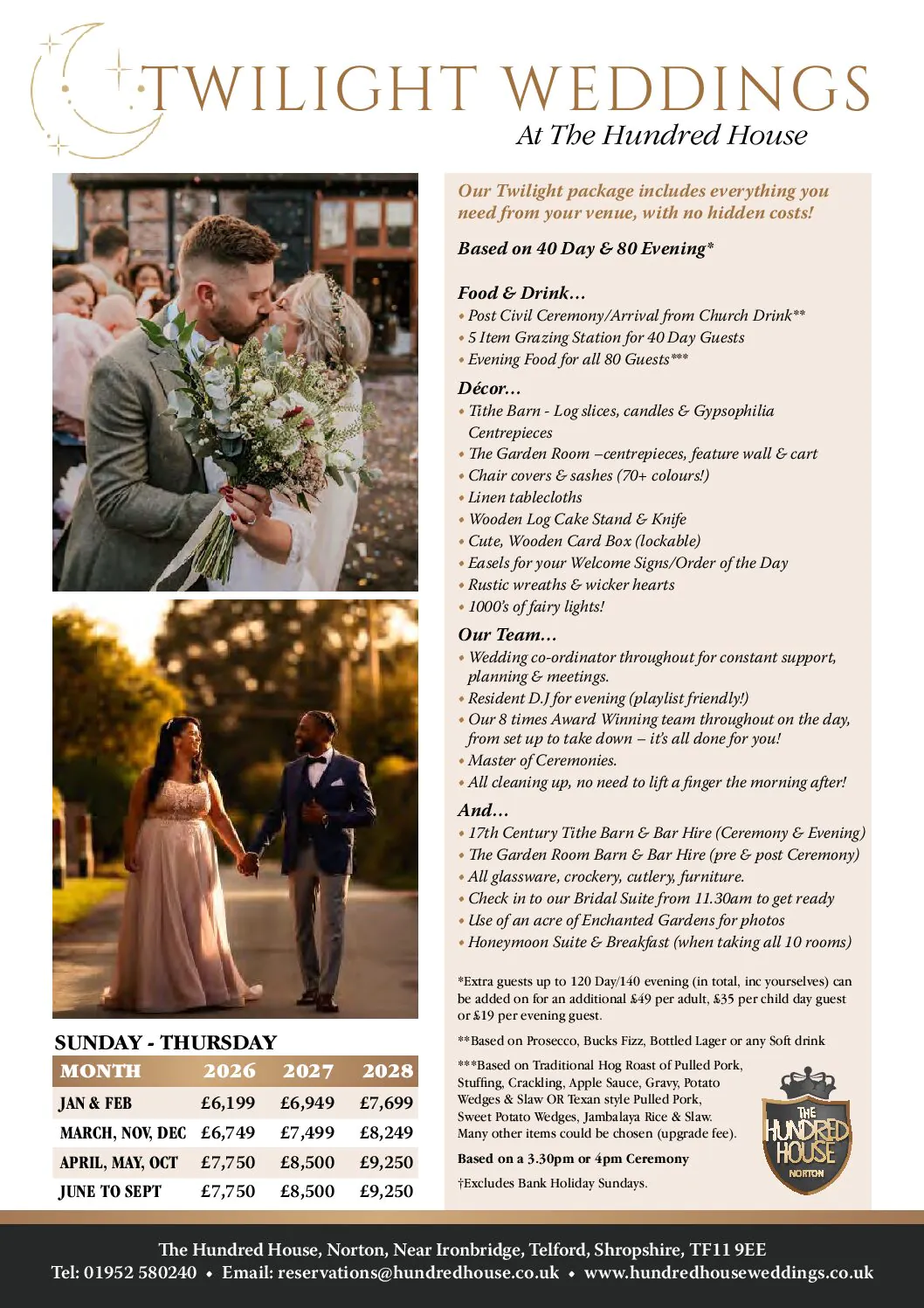 If you need your Wedding to be a Friday or Saturday, then we can still offer a Twilight Wedding, it’s just it would have to reach a minimum spend.